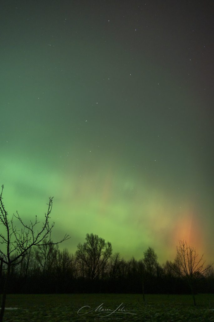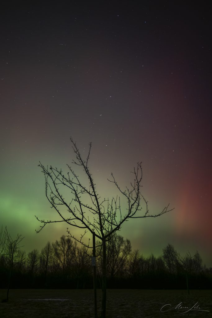 Ich hab noch mal meine Bilder vom 19.01. durchgesehen und noch zwei entdeckt, die ich gerne teilen würde. Sie sind auf dem Golfplatz in meiner Nähe entstanden und zeigen einen Apfelbaum, Polarlicht und den großen Wagen am Himmel.